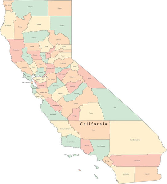 Multi Color California Map with Counties and County Names